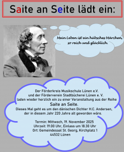 Es findet wieder eine Veranstaltung aus der Reihe „Saite an Seite“ statt. Am Mittwoch, 19. November 2025, sind Sie herzlich eingeladen zum märchenhaften Abend mit Hans Christian Andersen – wie gewohnt mit Literatur, Musik, kleiner Ausstellung und Pausenimbiss. Andersen wäre in diesem Jahr 220 Jahre alt geworden und bietet mehr als nur Märchen.